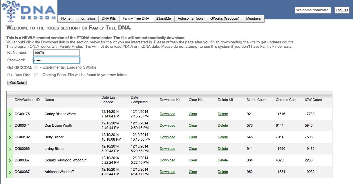 Fill in your own FamilyTreeDNA kit number and password as I did above. It may prompt the DNAgedcom userid - if so, erase that and replace it with your kit number instead. (Do not use your GEDMATCH kit number if you have one) Now click on Get Data and wait.