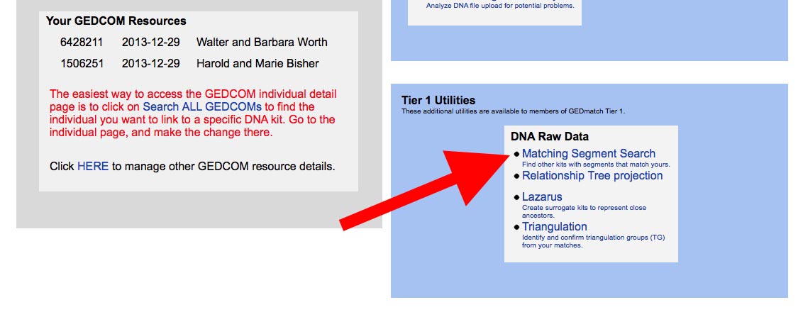 - Leaving the window above open, create a new browser window or tab and go to the www.gedmatch.com and logon. Click on "Matching Segment Search" in the Tier 1 tools menu near the bottom of the screen: