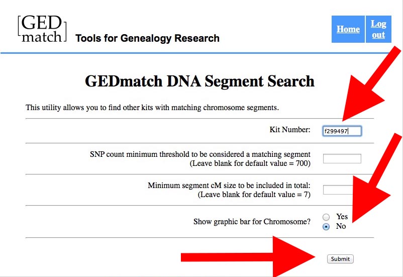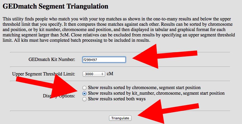 - Enter your GEDMATCH kit number and select the middle radio button (very important!) and click on the "Triangulate" button:
