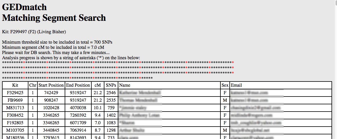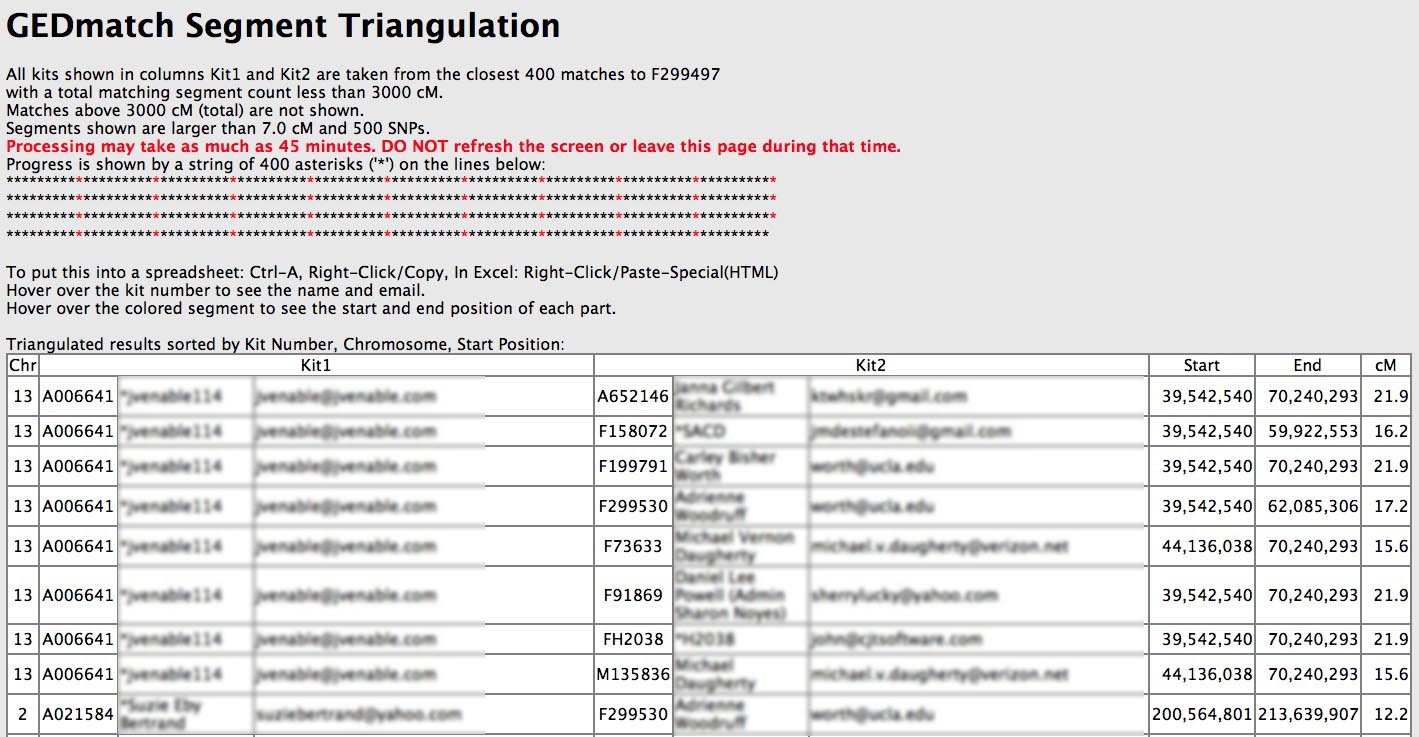 - Wait for the report to complete. The Triangulation report may take longer than the Matching Segment Report depending on how many In-Common-With matches you have and the current load on GEDMATCH's servers. When it finishes there will be 4 rows of asterisks on the screen and the screen will look something like this: