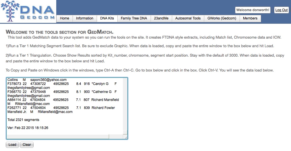 - Make sure the text-input box in DNAgedcom is empty (use the Clear button if you need to) and then paste the Triangulation report into the box with ctrl-v or command-v. Then click on the Load button.