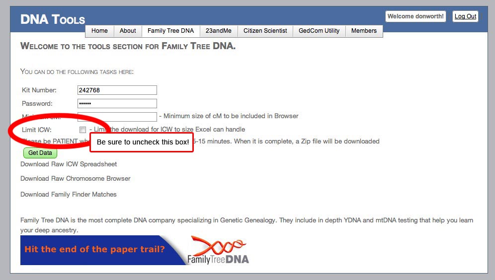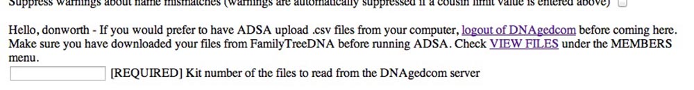 All you nave to do here is type in your FamilyTreeDNA kit number. ADSA will find all three of the files it needs on the server from that.