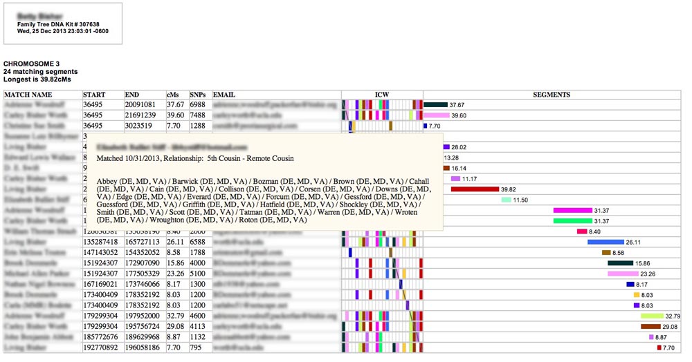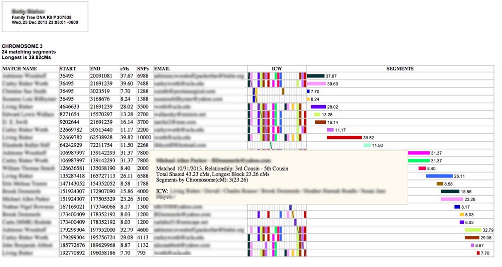 I created this tool in an attempt to put all the relevant information available that was needed to evaluate segment matches on a single, interactive web page. It relies on the three files for a single test kit that DNAgedcom.com collects from FamilyTreeDNA.com. These files include information about your matches, matching segment locations and sizes, and "in common with" (ICW) data. Using these files, the tool will construct a table for each chromosome which includes match and segment information as well as a visual graph of overlapping segments, juxtaposed with a customized, color-coded ICW matrix that will permit you to triangulate matching segments without having to look in multiple spreadsheets or on different screens in FamilyTreeDNA. Additional information, such as ancestral surnames, suggested relationship ranges, and matching segments and ICWs on other chromosomes is provided by hovering over match names or segments on the screen. Emails to persons you match may also be generated from the page. The web page produced by this program does not depend on any other files and may be saved as a stand-alone .html (or .htm) file that will function locally (or offline) in your browser. You can even email it to your matches as an attachment. You can play with a working sample output here.